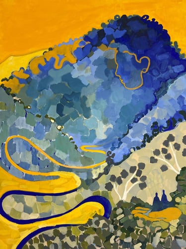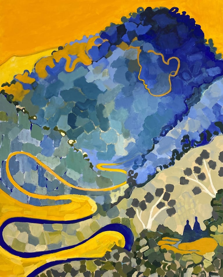 Originally, I imagined and began a painting titled “Body of Water”. Over time, this painting continued changing and felt as though it had to have a life of its own. As the painting changed over and over, just like the everchanging surface of water, I realised I too had to let go of my original idea and title. This was the image that emerged, along with the new title “Self-Reflection”. The figure came alive on the right-hand side and found in the ocean a reflection looking back at themself. As I let go of my own intentions the brushstrokes changed, becoming more gestured and painterly. The trees emerged as a series of rough blobs, which in past paintings I might have tried to “tidy”, “perfect” or “polish”. Instead, I found joy in their imperfections and felt a sense of excitement with this new way of painting. We too, like a body of water are everchanging, and much joy and realisation can be found if and when we allow ourselves to be just exactly that which wishes to emerge through us.
