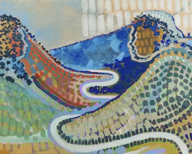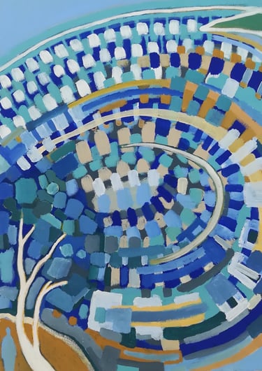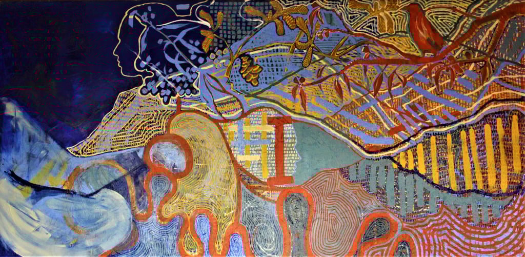 A sweeping coastline with two figures holding hands. They look out at the immensity of the ocean and headland below, beside are the twisting branches of an angophora, birds soaring above and ripples below. I wanted to capture the sense of awe and wonder that comes from looking out onto a scene like this. I often find a sense of relief and liberation as I am reminded of my “smallness” in comparison to the immense planet and cosmos. Within that feeling of awe is a kind of disappearing of “self”, where we can come to find a deep connection and unity with all of life. This painting connects to the video “I Am That”, and is also painted over many other images and lifetimes. To get to this point and picture many things came and went, the thickness and texture of the paint now shows the life of the canvas and the journey that went before.