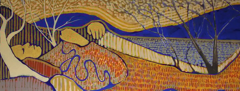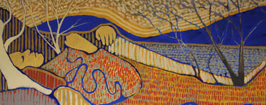As we walk on this Earth we pass over many processes of life and death. Leaf litter and old branches become soil. Bodies of water change shape and come and go leaving their memories in patterns in the earth. Rocks are formed and eroded by the power of the planet. Somehow with all of this immense activity over time there is still a sense of abiding peace and rest in nature. The original image that I had wished to paint in “Self Portrait of my Mother” came through in this painting. In some ways I feel that a process of grief had to continue before this “sacred restfulness” could be painted. Again the mountains and waterways, trees and rocks are intimately connected with the figure, until only the face and hands are what tell them apart from the earth. May we all find this sacred and life nurturing restfulness, in our minds, hearts, bodies and communities.