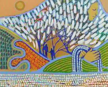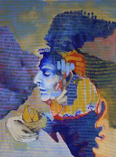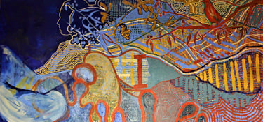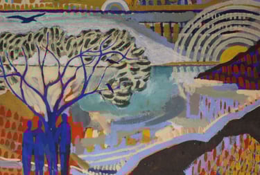 This painting came about in response to a song written by my sibling, and is the final image of the video titled “Family Tree". In the process of creating this painting many images came and went. The process of change and the many lives and deaths of this painting were a therapeutic access to grief and acceptance. Although I never knew what images would emerge, the final picture became my family. Myself, sibling, father and mother as the tree which we are shaded by. We look out upon the changeable landscape in a precious glimpse. We’re here but for a short time but the connections we feel and love we experience is part of the infinite and timeless source of all things.