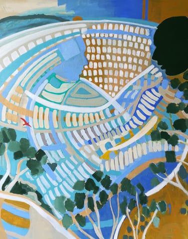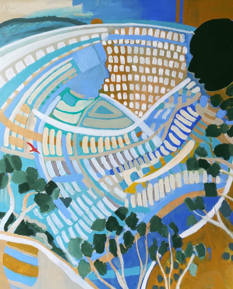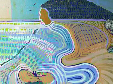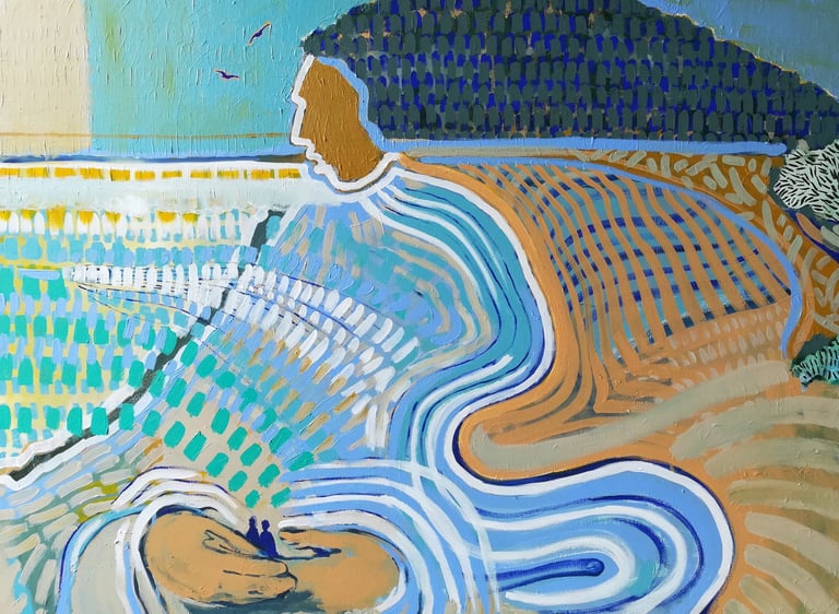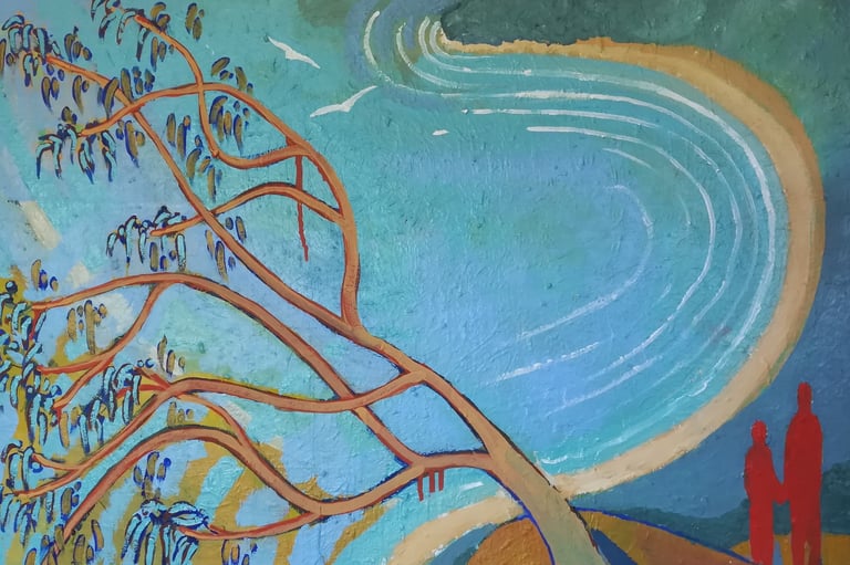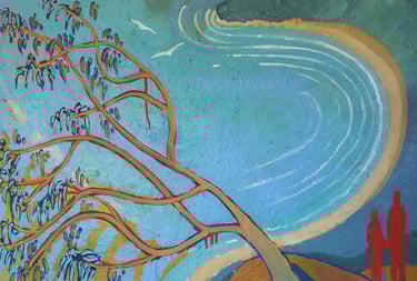 Just as Covid-19 hit our lives, my partner and I found ourselves afraid about the future, and concerned with how we could afford to live without work. During this period of time, nature was the greatest (if not only) source of relief and healing. When we looked at all of the life that is nurtured as this planet, we remembered the often forgotten source taking care of us all. The figures being held by the hands of the great headland look on to the vibrant reflections of the ocean, changing skies and birds circling. A boat zips across the water causing ripples, whilst the sand and shrubs of the coastline continue moving and changing with time. We look out upon the coast of the peninsular and feel a sense of being held, by something bigger and much more powerful than ourselves.