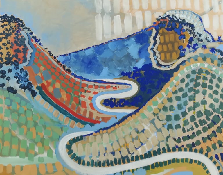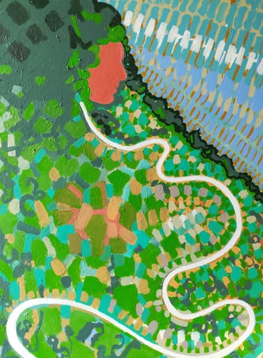 Originally, I imagined and began a painting titled “Body of Water”. Over time, this painting continued changing and felt as though it had to have a life of its own. As the painting changed over and over, just like the everchanging surface of water, I realised I too had to let go of my original idea and title. This was the image that emerged, along with the new title “Self-Reflection”. The figure came alive on the right-hand side and found in the ocean a reflection looking back at themself. As I let go of my own intentions the brushstrokes changed, becoming more gestured and painterly. The trees emerged as a series of rough blobs, which in past paintings I might have tried to “tidy”, “perfect” or “polish”. Instead, I found joy in their imperfections and felt a sense of excitement with this new way of painting. We too, like a body of water are everchanging, and much joy and realisation can be found if and when we allow ourselves to be just exactly that which wishes to emerge through us.