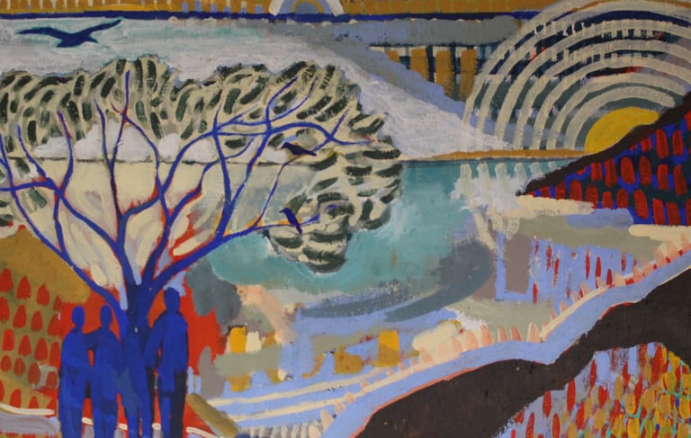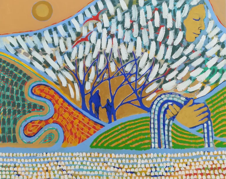 I think we find it easier to recognise consciousness when it looks more like us, but in truth there is consciousness in everything. The headland is alive as are all parts of this earth. The hands hold the heart, from which life-giving water pours. Our heads and hearts are both significant and necessary parts of this human experience. We need balance between thinking and feeling in order to live sustainably and harmoniously with the earth and each other. Brush strokes show the vibrancy of the trees, shrubs and grasses, at the centre, figures hold hands in mutual care and support whilst their spirits soar above as birds.