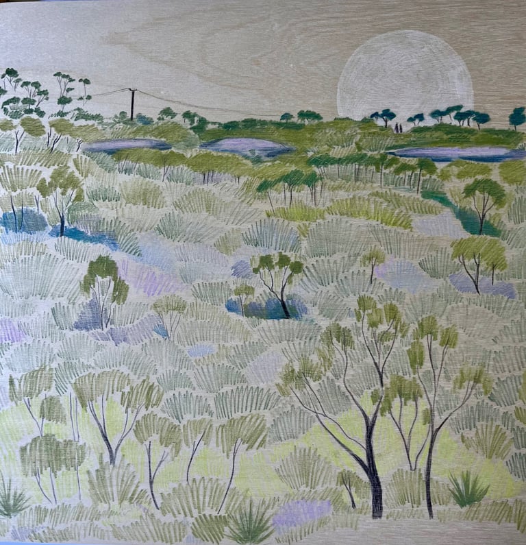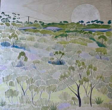 "When the Trees Sing" is a watercolour pencil on wood board painting I completed it in a state of wonder. I was tucked up on a big rock overlooking expanses of bush and water. Across the way were some powerlines dwarfed by the great expanse of trees, grasstrees and different bird species singing.